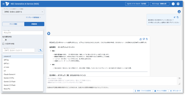 Atsushi I.:NGSの特徴の1つは、マルチLLM(Large Language Models:大規模言語モデル)に対応していることです。OpenAIのGPTシリーズだけでなく、NECが開発した「cotomi」、Claude、Geminiといった複数の言語モデルを採用しています。そのため利用目的に応じて最適なLLMを選択することが可能です。